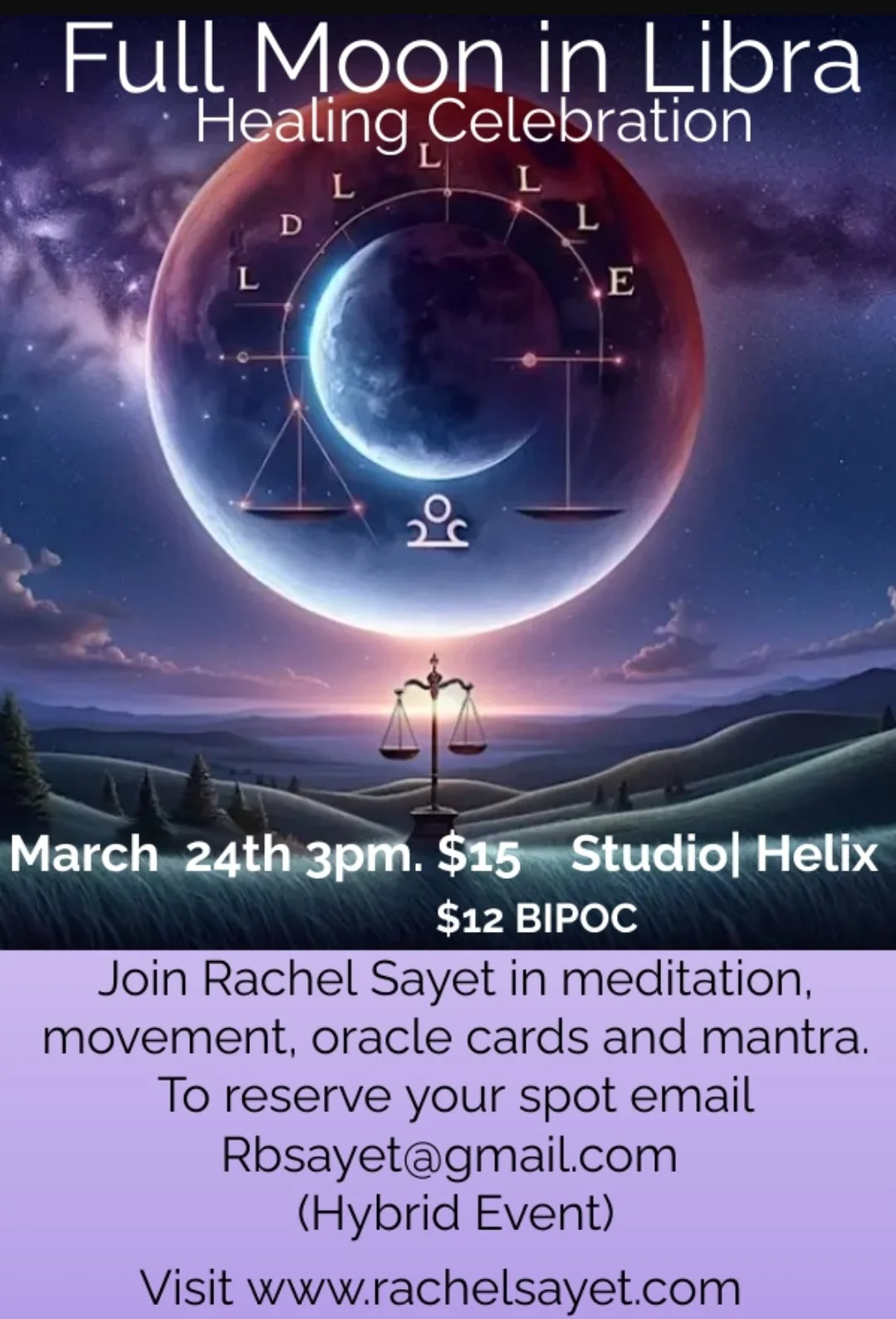 Join Rachel Sayet in meditation, movement, oracle cards and mantra. To reserve you spot email Rbsayet@gmail.com